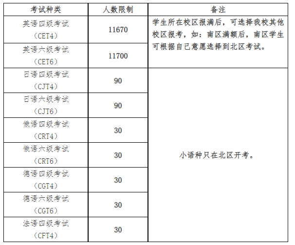二、报名对象及报名条件 1.报名对象: 公司在校全日制本科生、在校研究生和经相关学院确认过的在校成教、自考员工。 2.报名条件: (1)报考英语四级不受限制; (2)报考英语六级的须英语四级成绩达到425分或获得大学英语四级合格证书; (3)所有员工只能报考四级或六级中的一个等级。 三、报名缴费时间及办法 1.报名缴费时间: 2022年3月21日10:30 - 4月8月17:00。 请考生务必于报名后12小时内缴费,缴费成功才算报名成功。 2. 报名网址: 全国大学外语四、六级考试报名网(http://cet-bm.neea.edu.cn) 3.注意事项: (1)由于考试场地限制,本次考试将进行人数限制,先报先得,报满为止,具体人数限制如下: