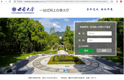 一、在浏览器输入网址:http://webvpn.swu.edu.cn ,进入学校一站式网上办事大厅登陆界面: