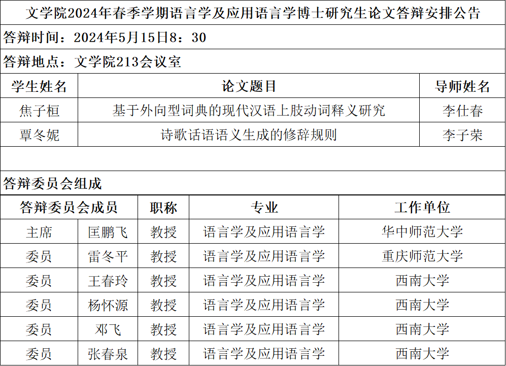 taptap188官网入口2024年春季学期语言学及应用语言学专业博士学位论文答辩安排公告