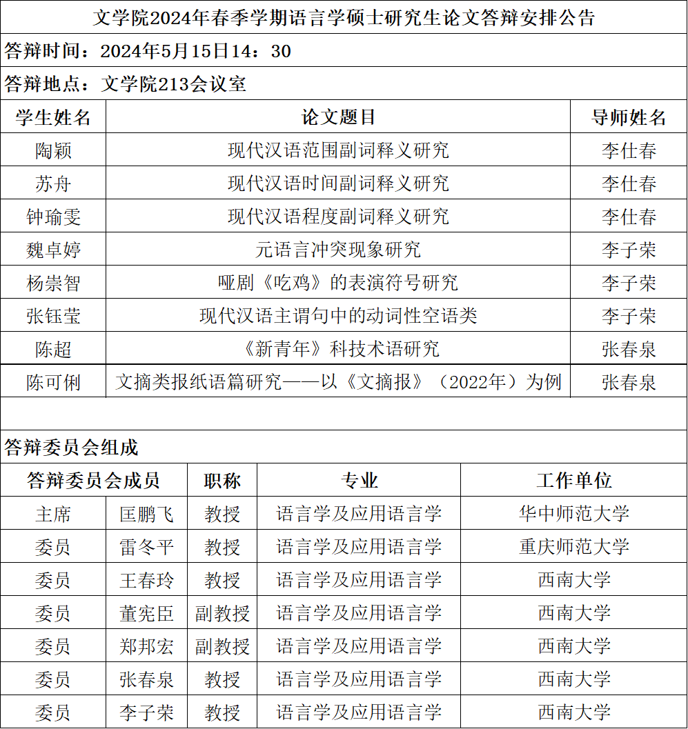 taptap188官网入口2024年春季学期语言学及应用语言学专业硕士学位论文答辩安排公告
