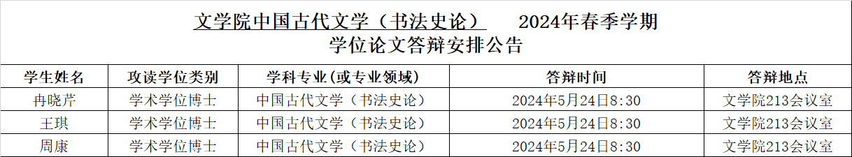 taptap188官网入口2024年春季学期中国古代文学(书法史论)专业博士学位论文答辩安排公告