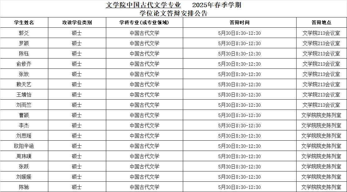 taptap188官网入口中国古代文学专业2025年春季学期学位论文答辩安排公告