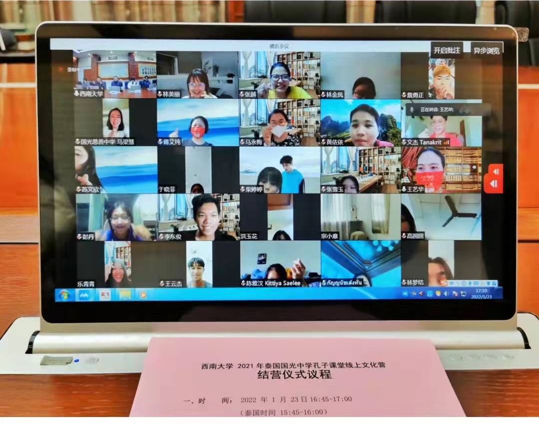 1月23日,taptap188官网入口2021年国光中学孔子课堂“云端汉语桥·共筑天下情”线上文化营结营仪式成功举行。泰国国光中学孔子课堂文化营领队马梁慧、中方课堂负责人蒋艾纯,泰国国光慈善中学高中中文本土教师代表,公司党委书记胡建军、相关科室负责人、教师代表及班主任出席活动,全体文化营营员参加结营仪式,活动由taptap188官网入口教师李娟主持。