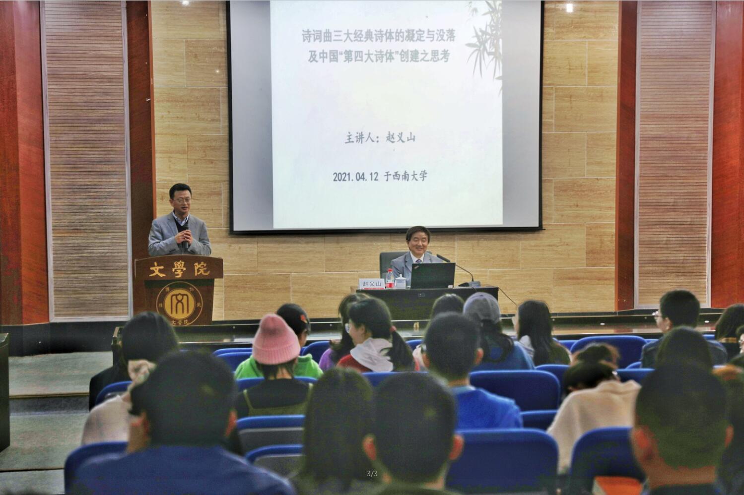 4月12日,四川师范大学狮山学者杰出教授赵义山做客taptap188官网入口名师讲坛,带来题为“诗词曲三大经典诗体的凝定与没落及中国‘第四大诗体’创建之思考”的讲座。此次讲座由taptap188官网入口古代文学教研室主任杨理论教授主持,taptap188官网入口相关专业的师生参加了讲座。