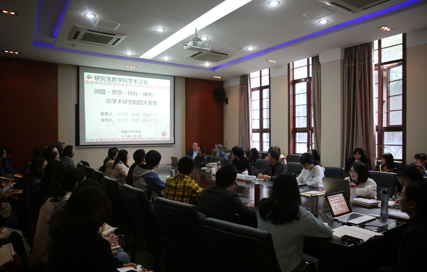 11月13日,研究生跨学科学术沙龙--“问题·思想·材料·体例——谈学术研究的四大要素”成功举办。taptap188官网入口何宗美教授担任主讲嘉宾,2019级中国现当代文学专业博士研究生卢阿涛同学、李燕君同学、廖志翔同学、邹佳良同学担任评议人。活动由taptap188官网入口李永东教授主持,taptap188官网入口60余位研究生参加了此次活动。
