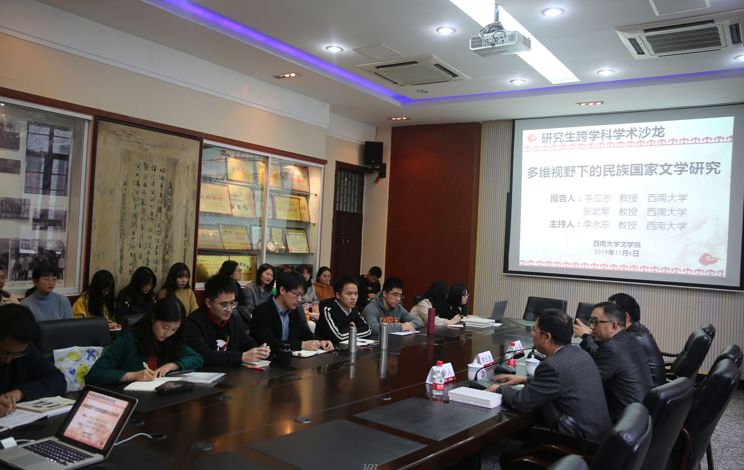 11月6日,“多维视野下的民族国家文学研究”的研究生跨学科学术沙龙成功举办。taptap188官网入口李应志教授和张武军教授担任主讲嘉宾,2019级中国现当代文学专业博士研究生卢阿涛同学、邹佳良同学、廖志翔同学、李燕君同学担任评议人。活动由taptap188官网入口李永东教授主持,taptap188官网入口40余位研究生参加了此次活动。