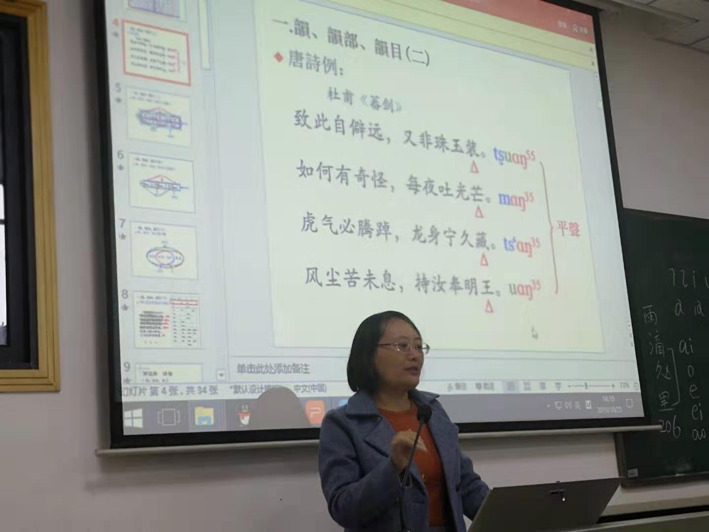 本次工作坊的活动内容是唐诗及唐诗押韵介绍。艾红娟副教授为员工讲解唐诗的格式,唐诗有两种格式:古体诗和今体诗。今体诗讲究押韵、平仄、对仗和字数。