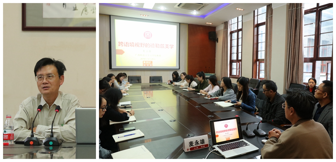 10月25日,广西师范大学taptap188官网入口麦永雄教授做客taptap188官网入口名师讲坛,带了题为“跨语境视野的德勒兹美学”的精彩讲座。讲座由taptap188官网入口比较文学与世界文学教研室主任李应志教授主持,付飞亮副教授出席讲座。现场气氛热烈,师生共赴一场思想盛会。