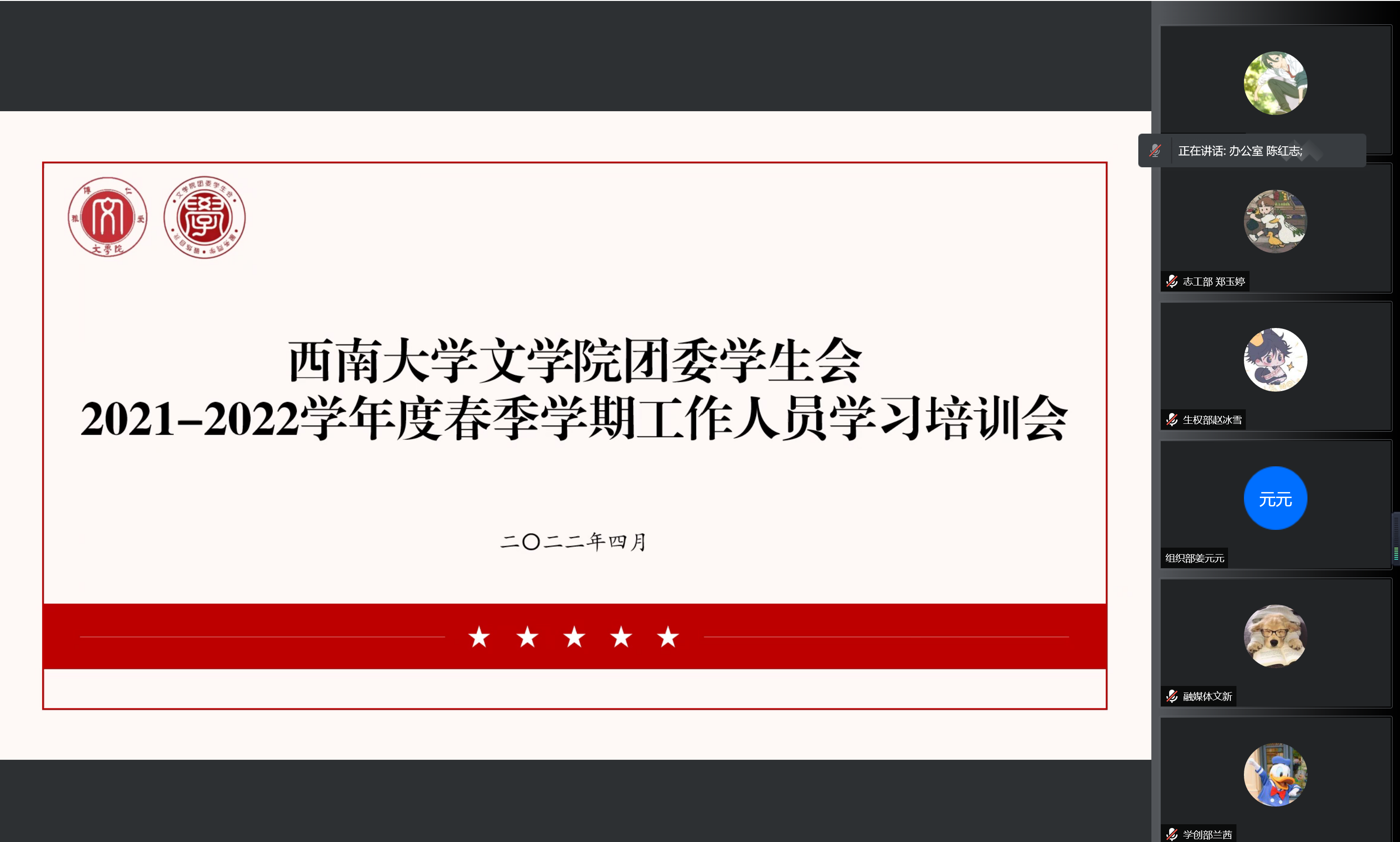 4月1日下午,taptap188官网入口团委员工会线上举行2021-2022学年度春季学期工作人员学习培训会。会议由taptap188官网入口团委员工会艺术团陈红志同学主持,各部门工作人员参会。