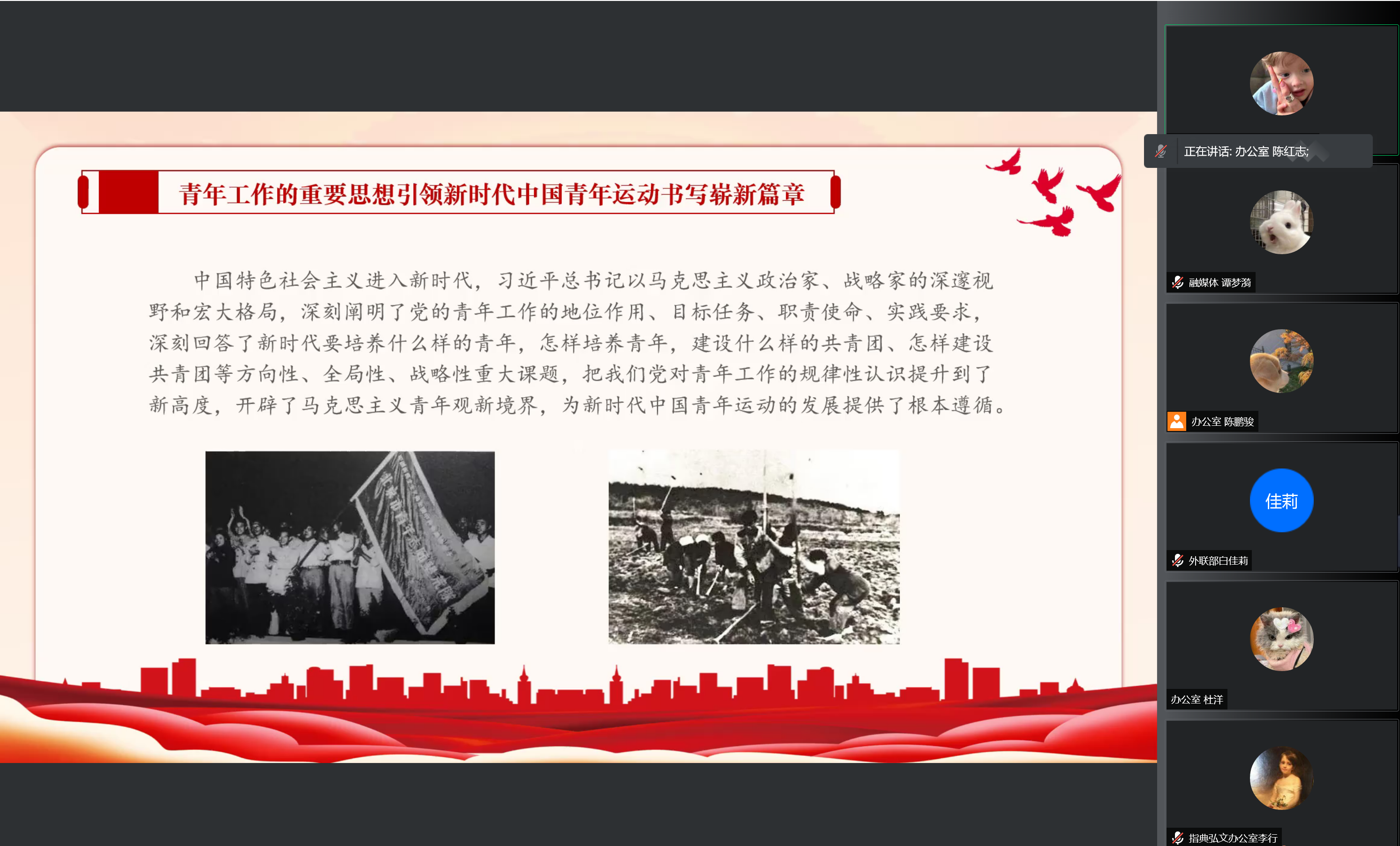 会议第一项议程为“党的青年运动史”,主持人从多个方面带领参会人员学习文章《党领导中国青年运动的光辉历程》。会议第二项议程为观看视频《百年青运史,青春正当时》。视频中的青年为民族独立、国家发展、人民幸福和社会进步踔厉奋发、笃行不怠,具有深刻的教育意义。会议第三项议程为员工代表发言。宋树鸣、冉杏两位同学先后就党的青年运动史学习感想和员工会工作感受两个方面进行了分享。