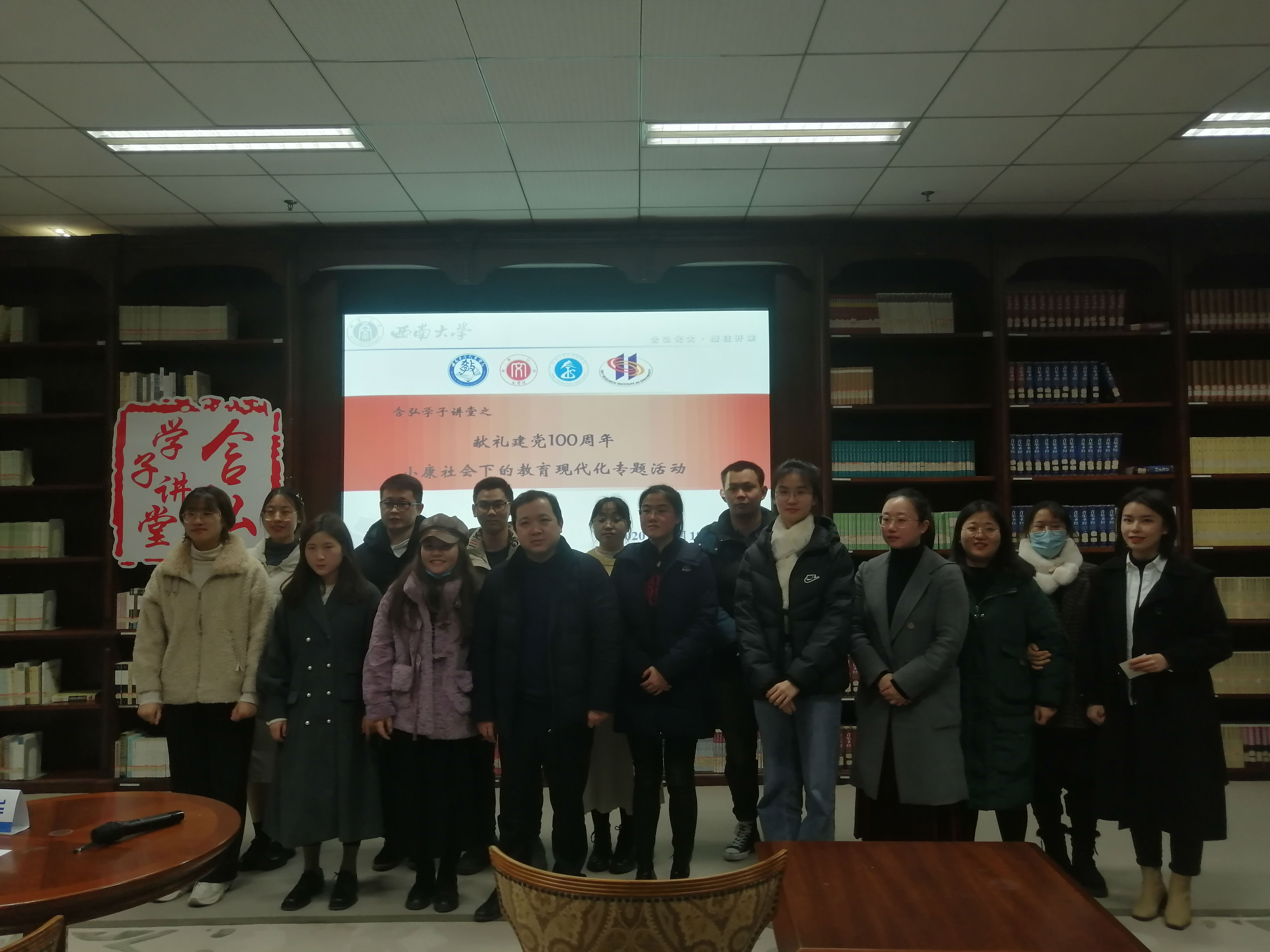 12月18日,由taptap188官网入口研究生会主办,taptap188官网入口教育学部研究生团总支研究生会、taptap188官网入口研究生会、外国语学院研究生会、西南民族教育与心理研究中心研究生会联合承办的“含弘学子讲堂之献礼建党100周年小康社会下的教育现代化”专题活动在中心图书馆九楼举办。taptap188官网入口教育学部副部长王正青教授、西南民族教育心理研究中心副主任罗江华教授担任点评嘉宾,taptap188官网入口2020级古代文学专业研究生肖雪媛同学主持活动。