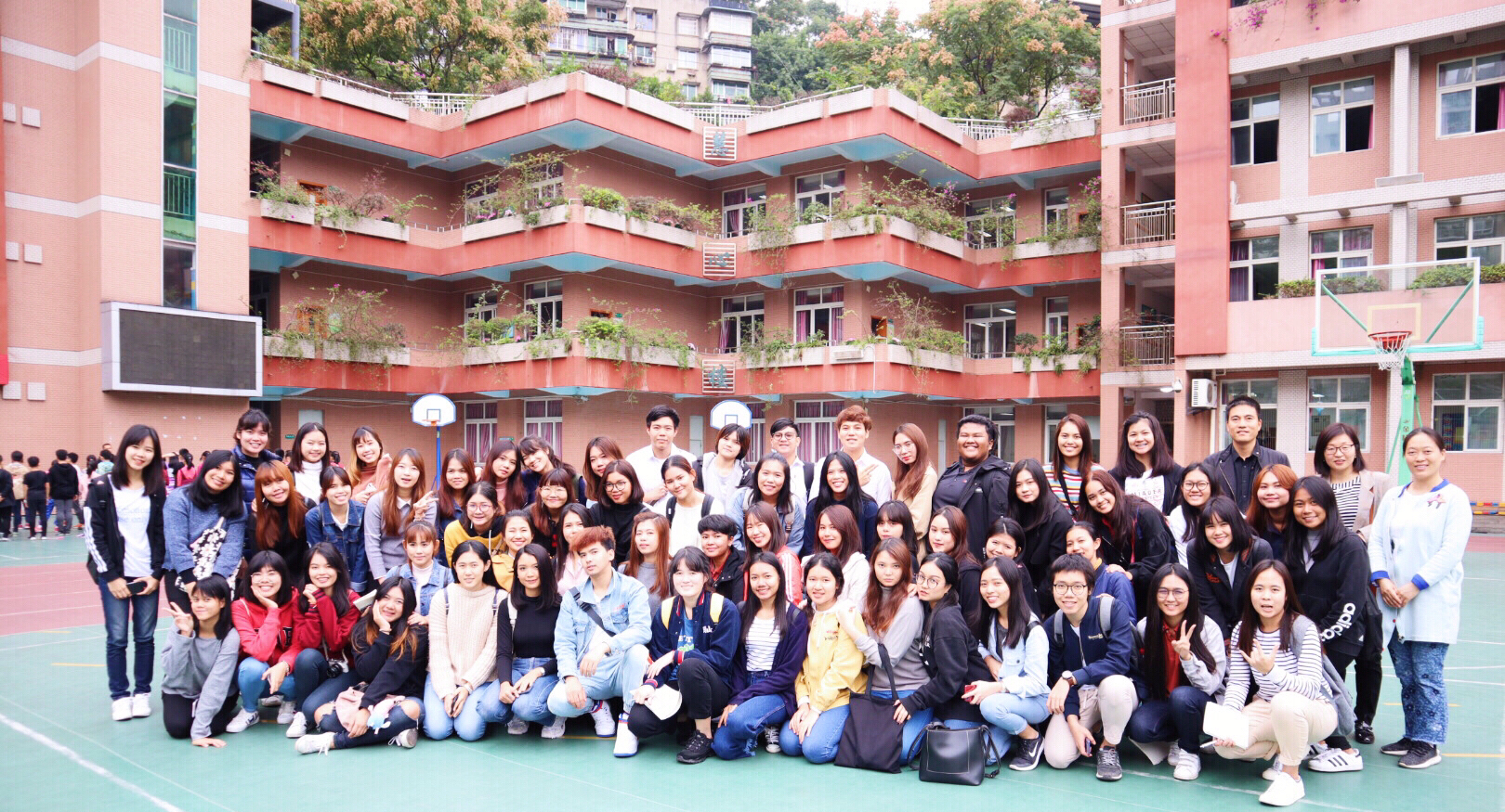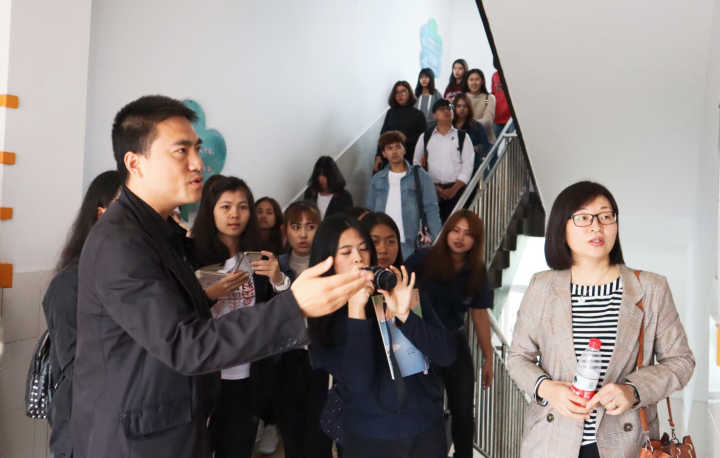 语文课观摩结束后,附小教务处主任潘德来老师带领全体泰国职工对学校进行了参观。潘老师介绍到,屋顶改建为员工可以活动的操场是附小的一大特色。不同年级所在教室外的廊道文化有其对应年级的特色。同时还补充到,附小非常重视国学教育。随后同学们还参观了逸夫楼的音乐、美术等艺术课堂,更全面地了解了西大学附属小学。十一点左右,本次泰国职工参观taptap188官网入口附属小学的活动在全体师生的合影中顺利结束。