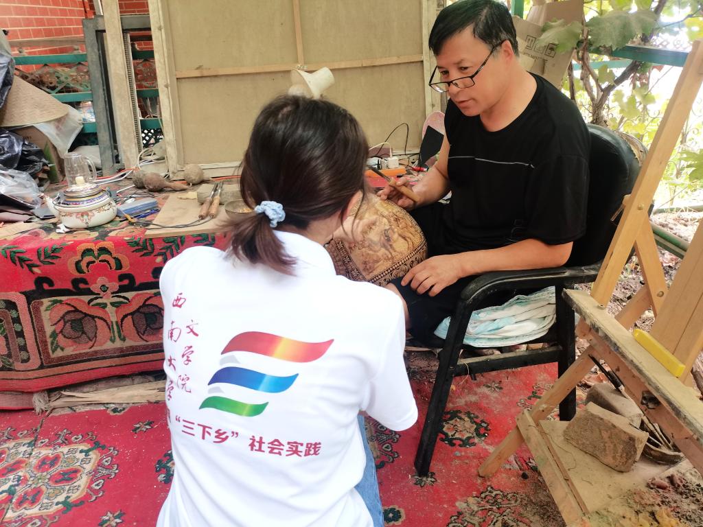 在麦盖提县,新疆小分队来到了民族画家买买提力·卡地尔家中。与买买提力老师对话过程中,成员们了解了葫芦烙铁画、木板雕刻画等多种艺术类型的创作灵感、艺术形式和内容选择。实践团成员阿力米拉在访谈结束后表示:“少数民族地区也有很多将本民族特色文化与中华文化紧密结合而不断碰撞和创造出新的艺术与美的传承的人物,我们也应该认识他们,去倾听属于他们的故事。”
