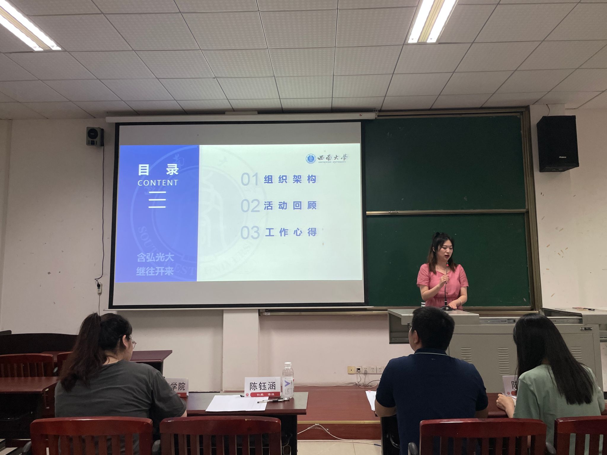主席团成员陈钰涵介绍了taptap188官网入口研究生会的组织架构,明确了主席团及各部门的职责。通过回顾春季学期重要板块,从思想政治建设、学术科研建设、就业服务与社会实践建设、文艺体育建设及宣传平台建设五个方面对本学期的工作进行了总结,从中吸取经验、补足缺点,为下学期工作的开展奠定了坚实的基础。