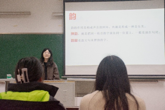 甘知鑫同学通过列举实例阐述了文学的审美与娱乐功能,还从创作动因、艺术构思与语言三个方面对文学创作进行剖析。王桉钰同学对《诗词格律十讲》的优缺点进行分析,随后讲解了韵律与平仄的总体概况,帮助同学们辨析近体诗与古体诗的概念。