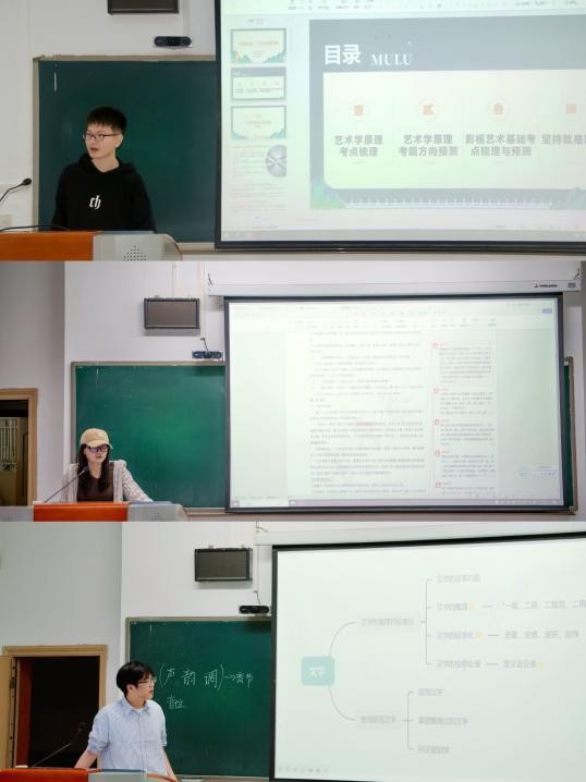 巨强同学首先结合近年命题趋势,系统梳理了两门课程的核心考点。在艺术学原理部分,他通过具体题型示范解题思路,增强同学们对理论知识的理解与应用能力;在影视艺术基础部分,他则从历年真题出发,预测潜在命题方向,并分享答题技巧。李漫同学首先从真题出发分析考情与新题型,讲解相应的答题方法,提出了“四步走”的高效学习方法,并分阶段梳理了外国文学史的脉络。谢楠同学围绕《现代汉语》,梳理了书中六大章节的核心知识点;同时聚焦《语言学纲要》,根据目录框架,拆解了各章节关键考点。