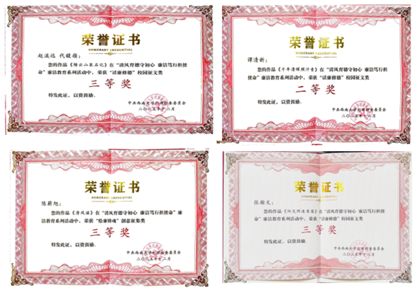 公司选送作品紧扣廉洁主题,构思新颖、内涵丰富,展现了对廉洁文化的深刻理解。经学校评审,谭清新同学作品《千年清晖照汗青》荣获征文类二等奖,张瀚文同学作品《阳光照进角落》、赵溪远同学作品《缙云山泉石记》荣获征文类三等奖,陈薪旭同学作品《清风谣》荣获创意征集类三等奖。