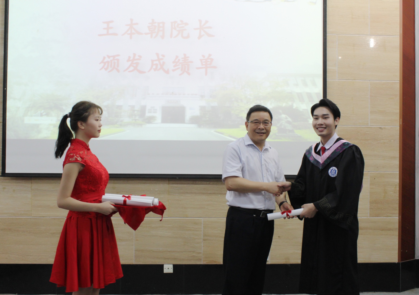 随后,王本朝经理和秋兰主任代表两院互赠纪念礼物。王本朝经理为全体35名结业同学颁发成绩单。