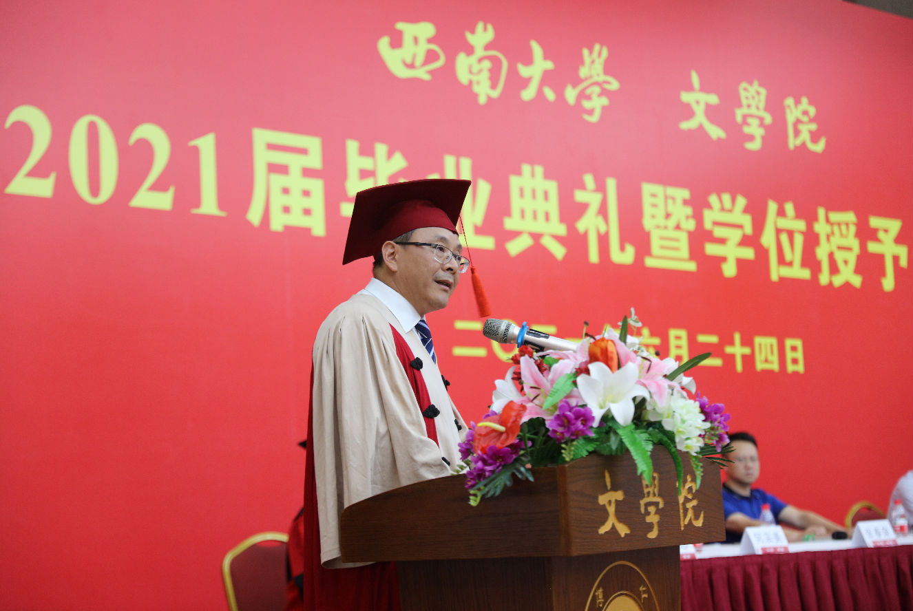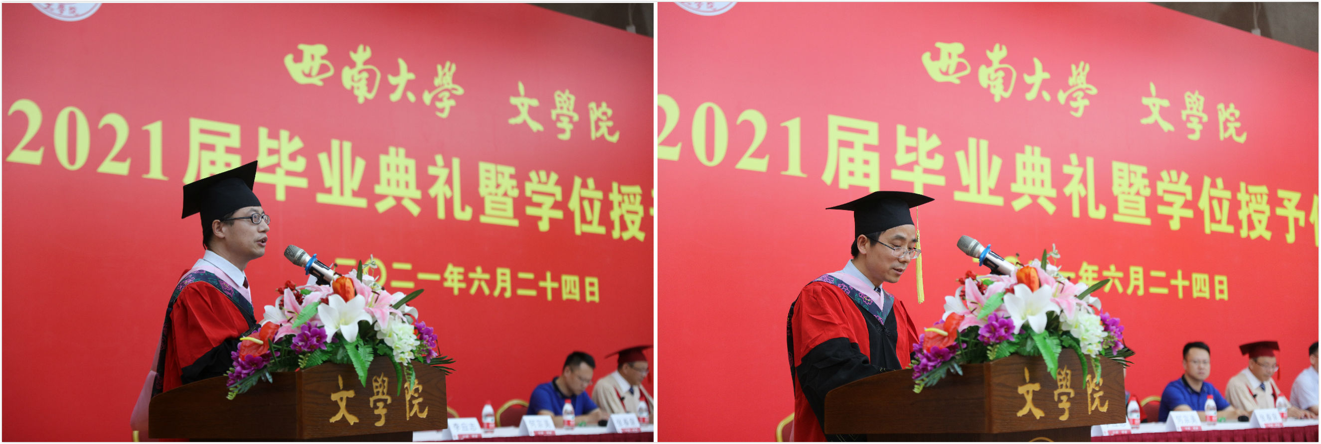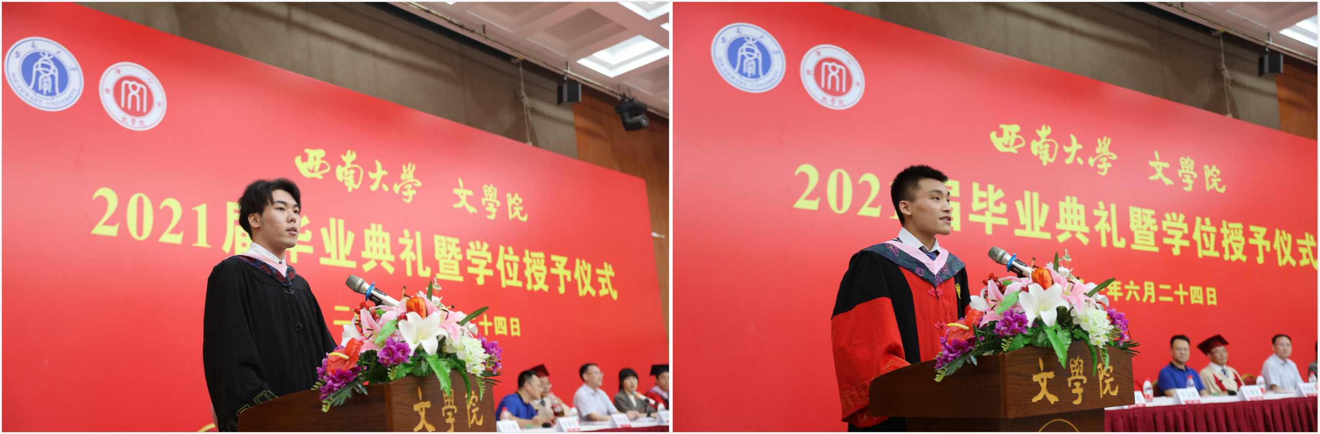 2017级汉语言文学专业本科生孙旭江、2018级中国现当代文学专业博士生高强先后代表毕业员工发言。孙旭江在校期间获国家奖学金,校特等奖学金等各类市级、校级荣誉共计30余项。他分享了大学四年在taptap188官网入口的成长与收获:做有“深度”的人,善于在奋斗中收获成长;做有“热度”的人,勇于在实践中承担责任;做有“温度”的人,永远要记住感谢与感恩。高强讲述了自己由工转文的蜕变和思想观念深造的经历,向学校、学院、老师和同学们表示感谢,分享了自己对工科文科差异和学院精神文化的理解。他鼓励taptap188官网入口毕业学子紧跟时代步伐,把握时代机遇,养成综合化的思维意识,保持读书人的纯良。