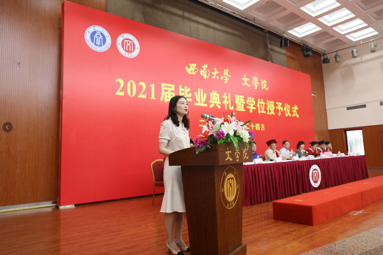 教师代表、taptap188官网入口汉语国际教育系主任胡琳副教授分享了自己在孔子学院工作期间的经历和所见所思,表达了对中华文化的自豪以及对taptap188官网入口毕业生的期许,告诫大家即便面对迷茫与挫折,也不要忘记拥有中华五千年语言文化的财富,以及用知识沉淀心性,战胜困难的力量。她希望taptap188官网入口毕业学子既要有责任、有担当,也要有诗意、有情怀。