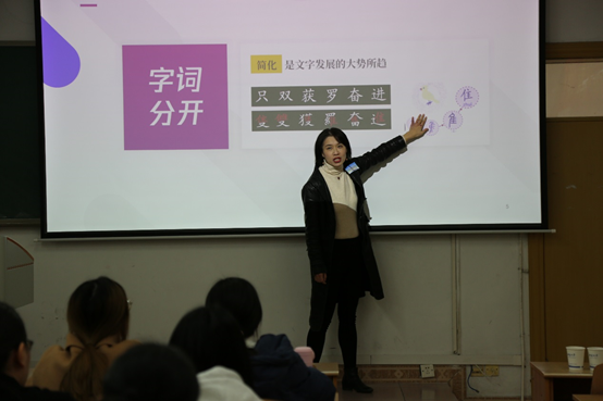 决赛中,毛志萍老师生动有趣地讲解了汉字的造字法,比较了传统造字法和新的造字法,教学水平得到了评委组专家的一致认可。