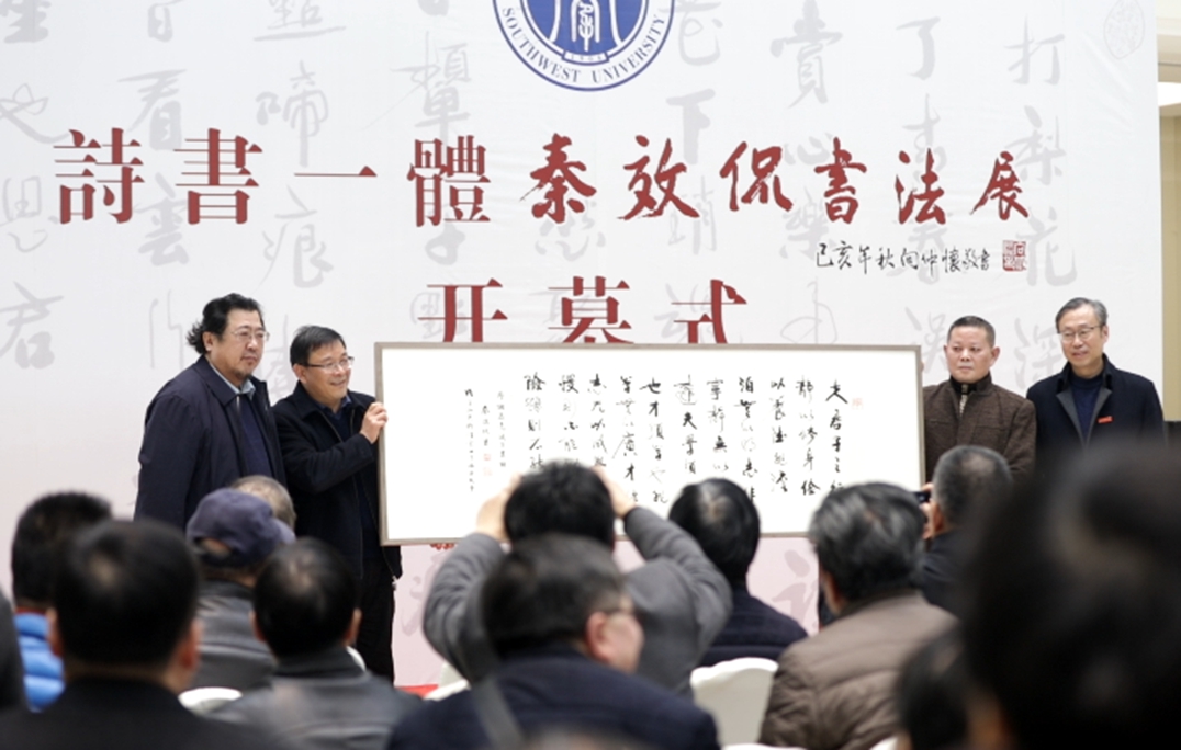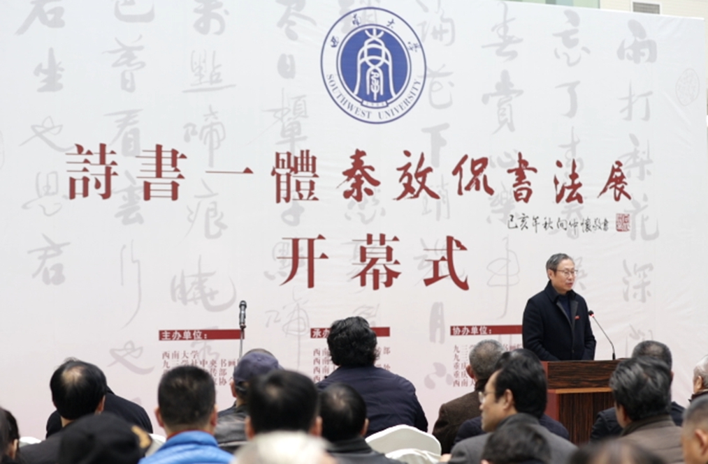 12月5日,由taptap188官网入口、九三学社中央书画院、北碚区委宣传部、重庆市书法家协会主办,taptap188官网入口党委宣传部、taptap188官网入口、社会科学处、出版社、博物馆承办,九三学社重庆书画院、九三学社重庆市北碚区委、重庆缙云书画院、重庆市北碚区书法家协会、taptap188官网入口中国书法研究所协办的“秦效侃书法作品展暨taptap188官网入口第四届书法论坛”在学校博物馆举行开幕仪式。