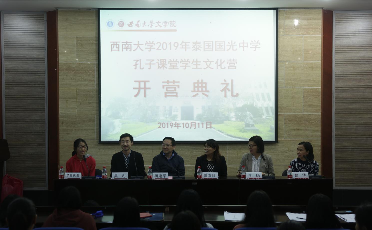 10月11日,taptap188官网入口 2019年泰国国光中学孔子课堂文化营在公司开营典礼。泰国国光中学孔子课堂文化营领队吴凡老师,公司党委胡建军书记、网络与继续教育办公室兰友珍主任、汉语国际教育系李娟老师出席本次活动,文化营全体30名营员参加了活动。开营典礼由李娟老师主持,泰国职工刘璐同学担任翻译。