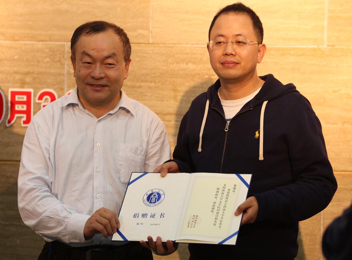捐赠方代表、原西南师范大学中文系92级员工、重庆中山文化产业投资有限公司董事长张直表示,难忘学校、学院、老师对我们的培养、帮助,捐赠“吴宓基金”,寄托着我们的文学精神、文院情怀,希望更多优秀的师弟师妹们在“吴宓基金”助推下,畅游学海,励志人生。