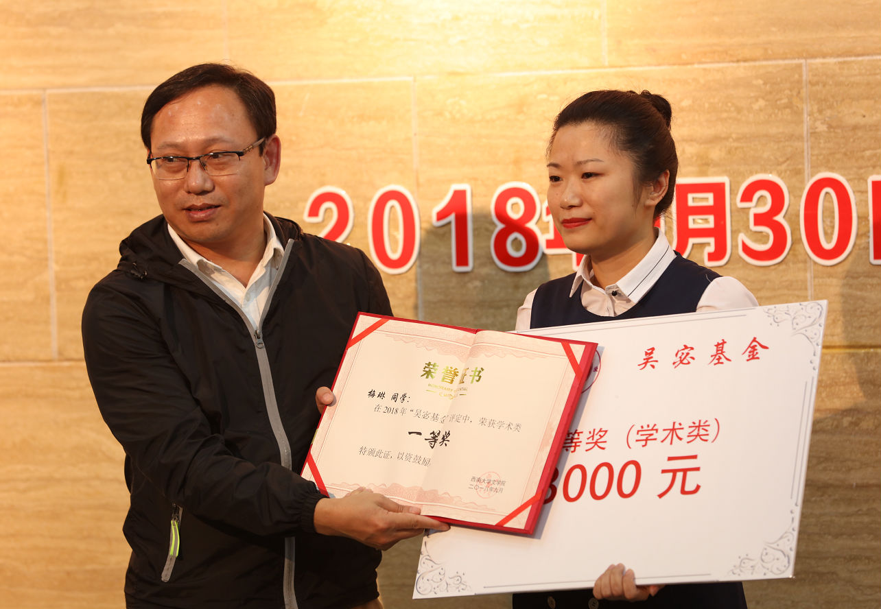 获奖员工代表梅琳、郭大章先后发言,对taptap188官网入口师兄师姐们捐赠“吴宓基金”表示感谢,表示将在今后的学习、工作、生活中继续拼搏努力,奋发有为,将西大精神、文院精神、吴宓精神发扬光大。