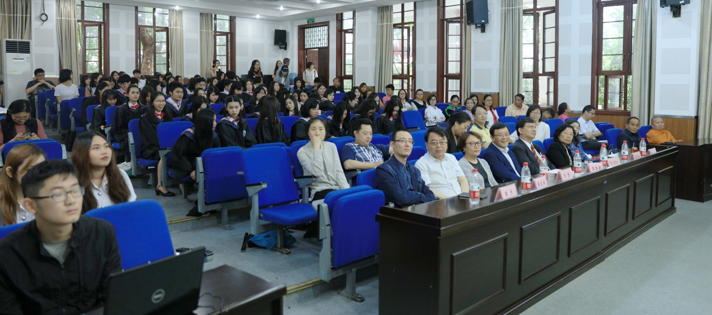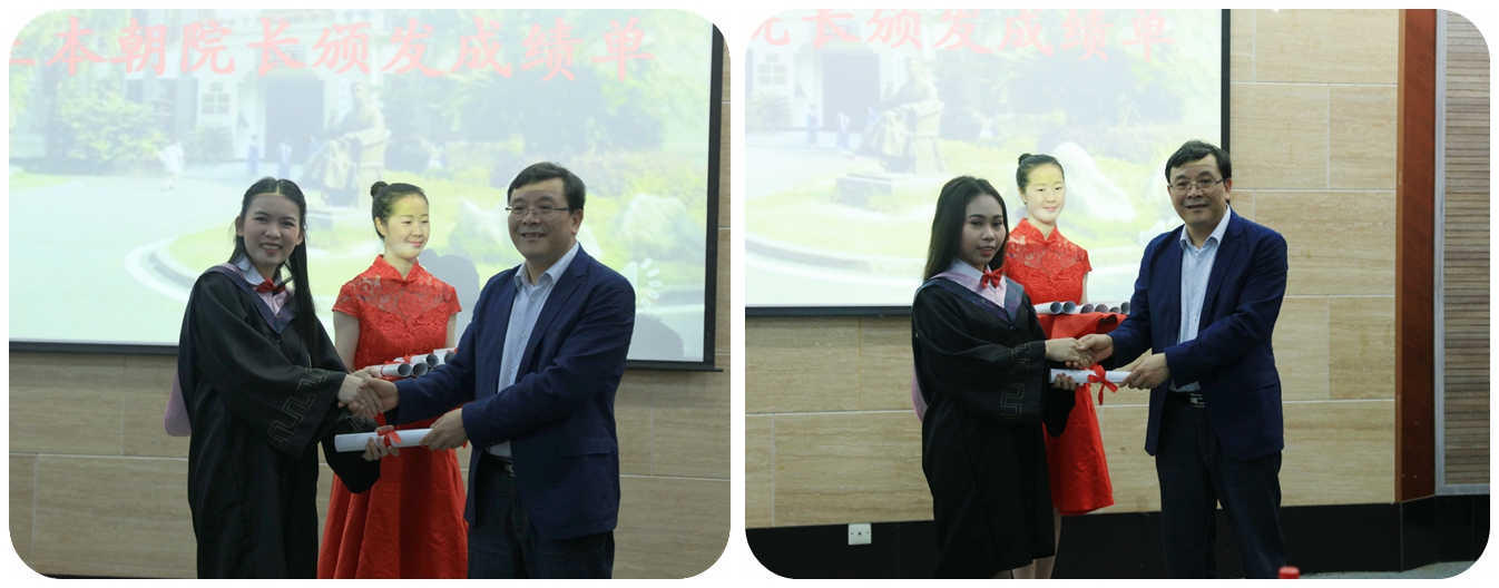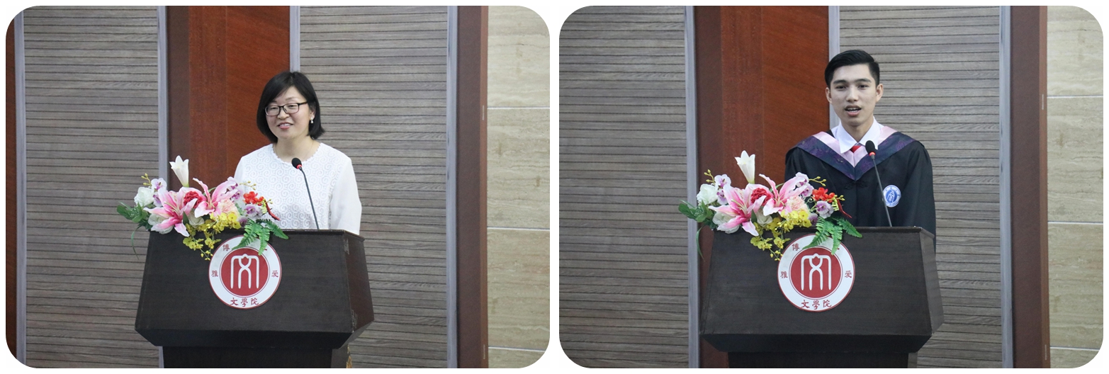 最后,荣获2017年度中国政府优秀来华职工奖学金的泰国职工艾丹龙代表全体员工发言。艾丹龙同学以一口流利的汉语饱蘸情感诉出衷肠,他代表全体职工对辛勤培育他们的老师表达诚挚的感谢,对支持自己完成学业的父母敬以深深的感激,对同窗共读的同学表达依依别情。