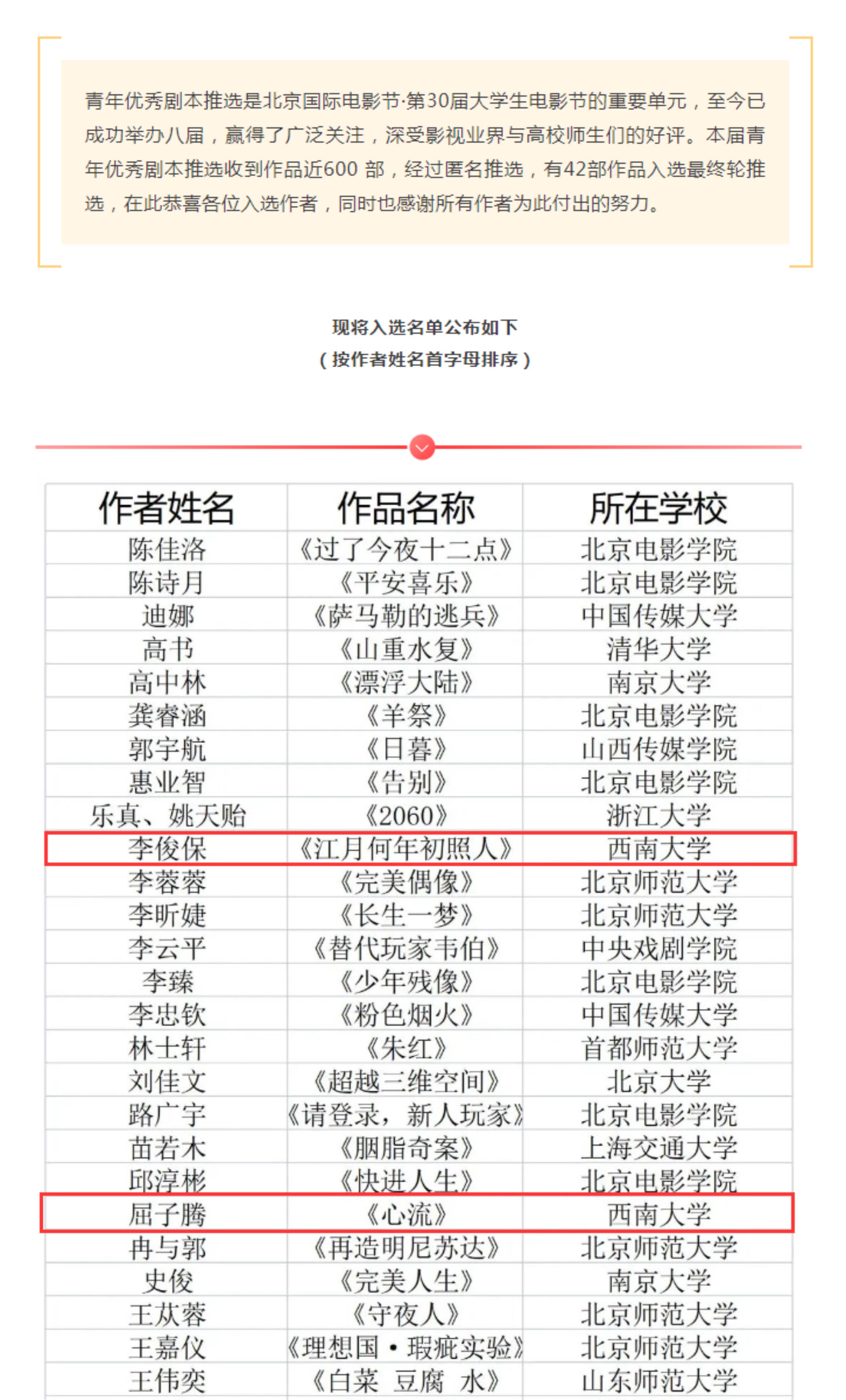 近日,北京国际电影节·第30届老员工电影节·第9届青年优秀剧本的推选结果公布,taptap188官网入口2021级电影学专业研究生李俊保创作的剧本《江月何年初照人》、2020级戏剧影视文学专业本科生屈子腾创作的剧本《心流》成功入选,公司为该类获奖的西南片区唯一获奖单位。