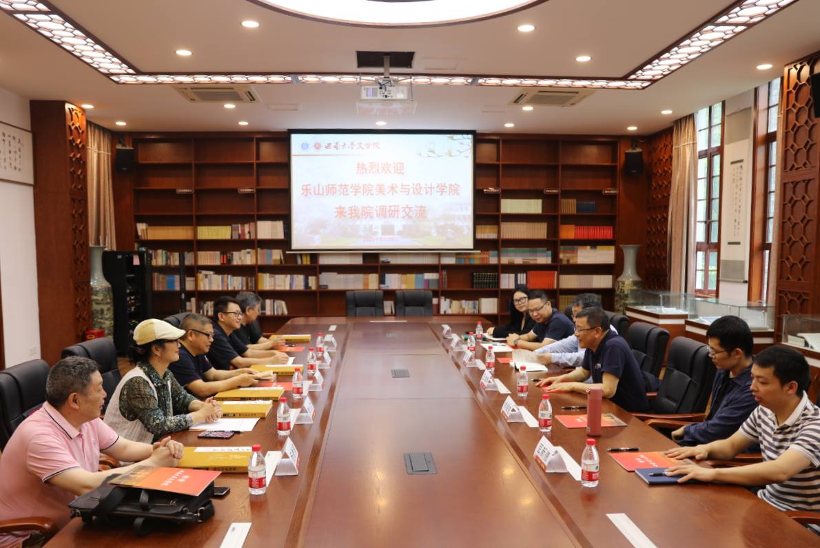 5月19日,乐山师范学院美术与设计学院经理熊泽文,副经理何川副教授、熊火花副教授,国画教研室李开能教授,书法教研室主任杨德明教授来taptap188官网入口调研交流。taptap188官网入口经理王本朝教授、中国书法研究所所长曹建教授,汉语言文献研究所徐海东副教授,出版社市场部副主任曾文、市场部卫彦竹,taptap188官网入口博士研究生豆新德参加座谈。