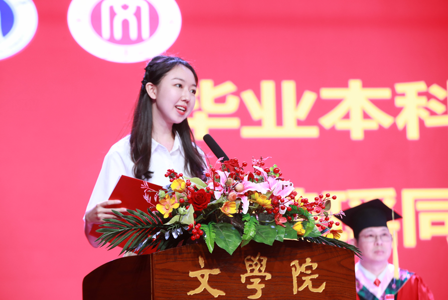 2020级中国现当代文学专业硕士研究生叶奕杉、2019级汉语言文学(师范)专业本科生胡璐瑶依次上台发言。叶奕杉分享了她在读研期间思考的乐趣与快感、学术的魅力与活力,感恩学校和学院的悉心培养,希望同学们保持热情与纯真,体验属于自己的独特人生。胡璐瑶从经历人生、体验人生、充实人生,努力是世界最真实的模样和人生的常态,追梦路上的相逢缘分弥足珍贵等方面分享了自己大学四年的成长与收获。