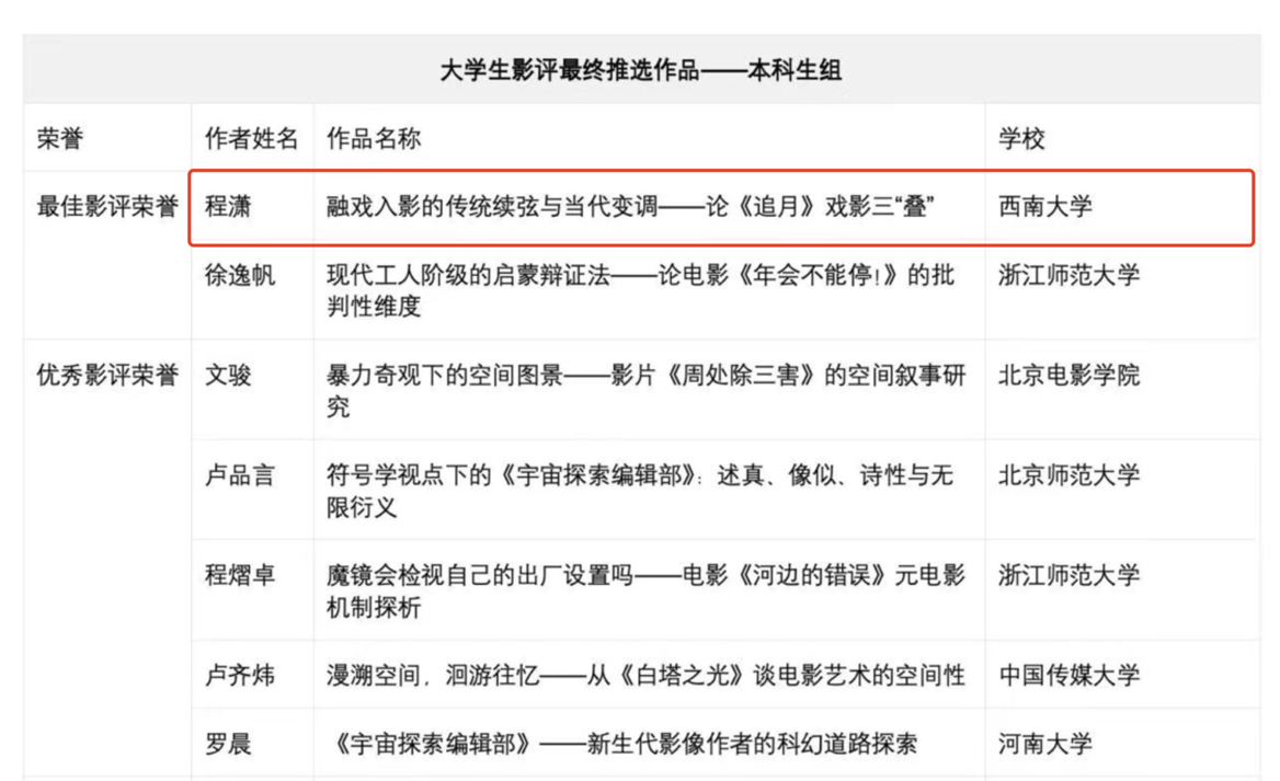 2024年4月28日,“北京国际电影节·第31届老员工电影节”主办方公布2024年度老员工影评推送结果,taptap188官网入口徐爽副教授指导的2021级戏剧与影视文学专业本科生程潇的作品《融戏入影的传统续弦与当代变调——论〈追月〉戏影三“叠”》荣获本科生组最佳影评荣誉;2023级电影专业王聪的作品《<白塔之光>:审慎者的乡愁遗产》荣获研究生组最佳影评荣誉。