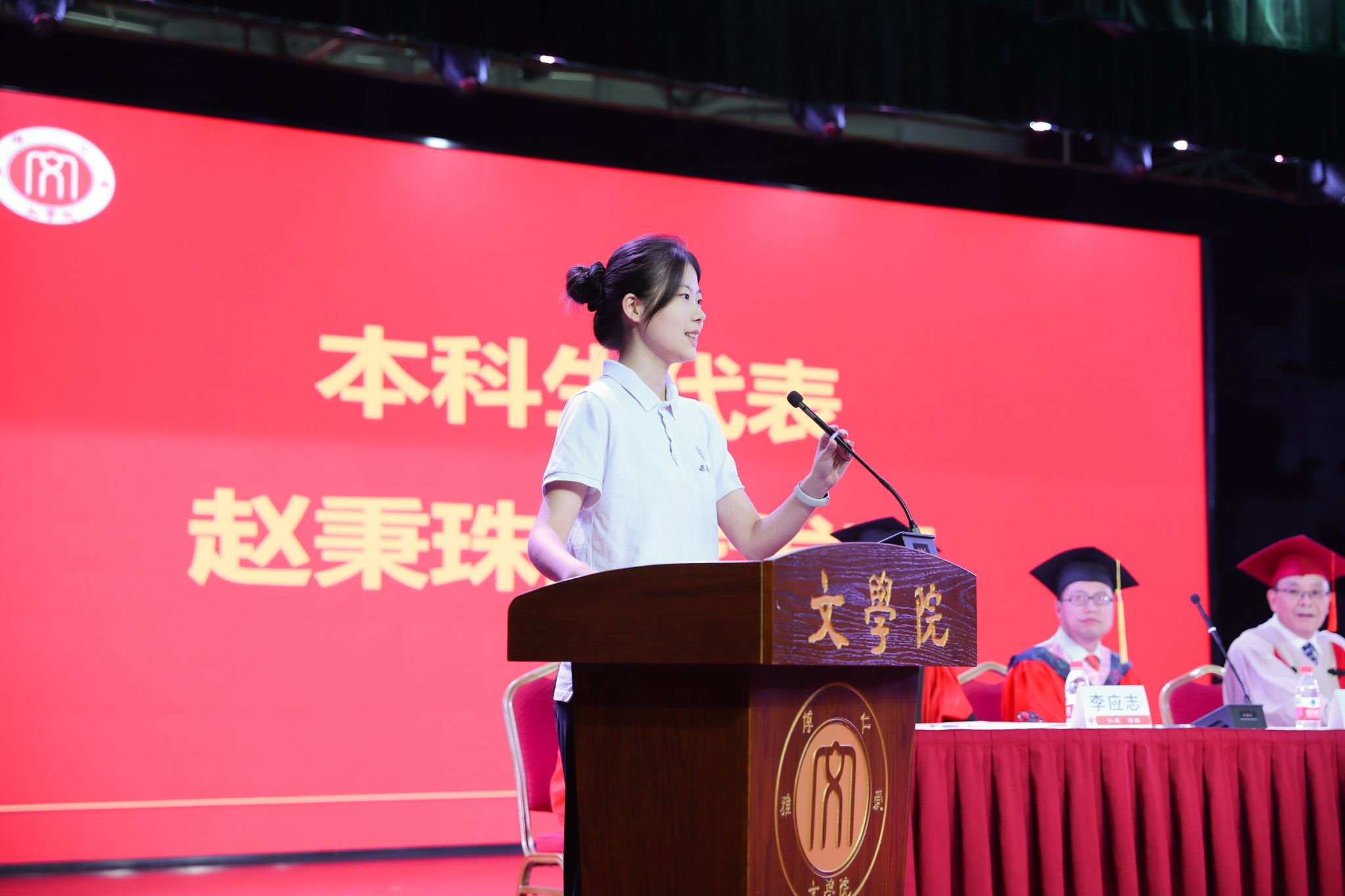 2022级中国现古代文学专业硕士研究生周玮璞、2021级汉语言文学(国家优师专项)专业本科生赵秉珠依次上台发言。周玮璞分享了读研期间的学术成长,感恩学院培养,号召同学们长怀热烈、永葆清澈,坚定前行,体验独特人生。赵秉珠分享了本科“在行中学”实践的体悟与成长,希望同学们带着“看见”的能力与“扎根”的意义,在各领域坚定前行。