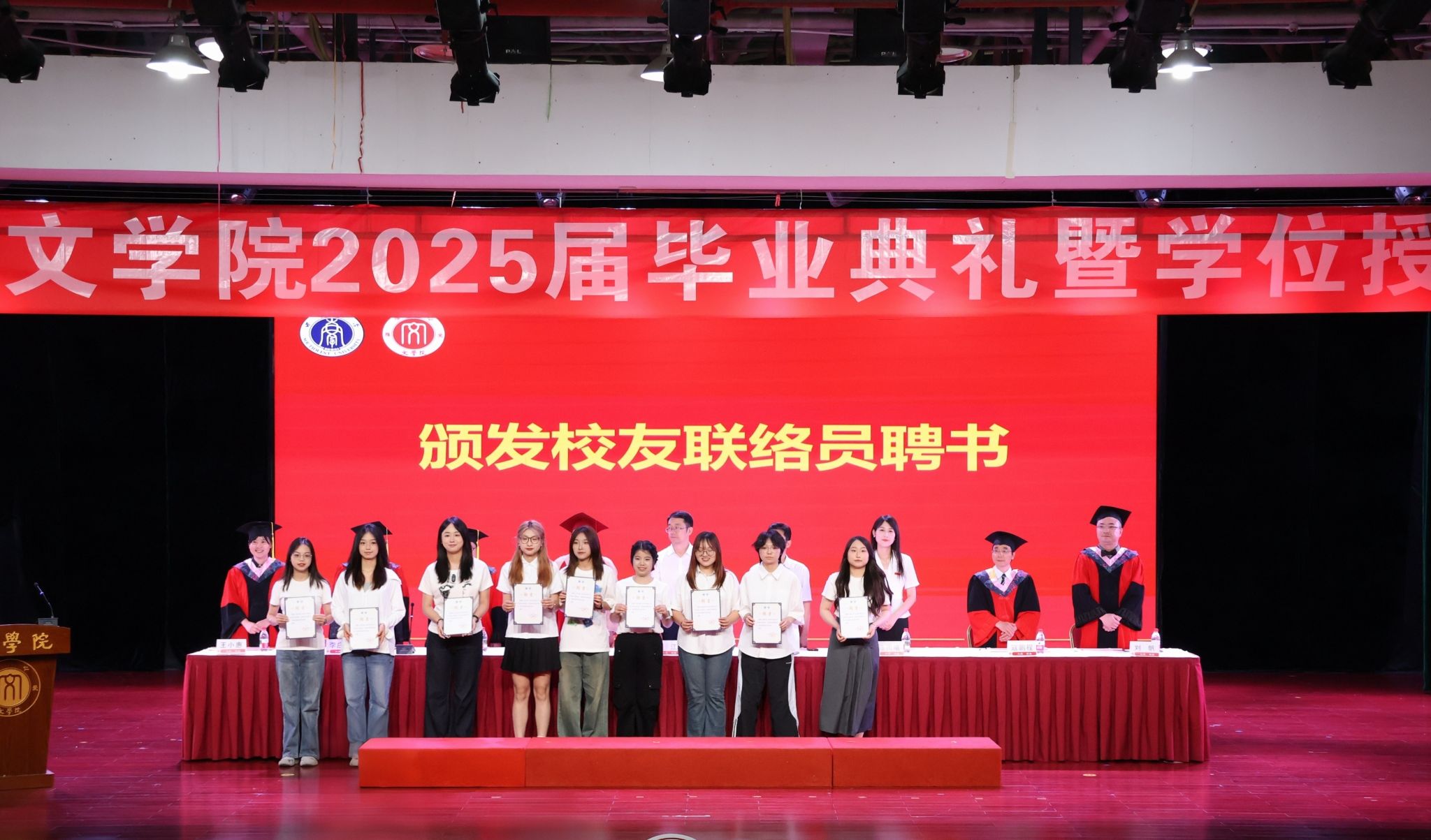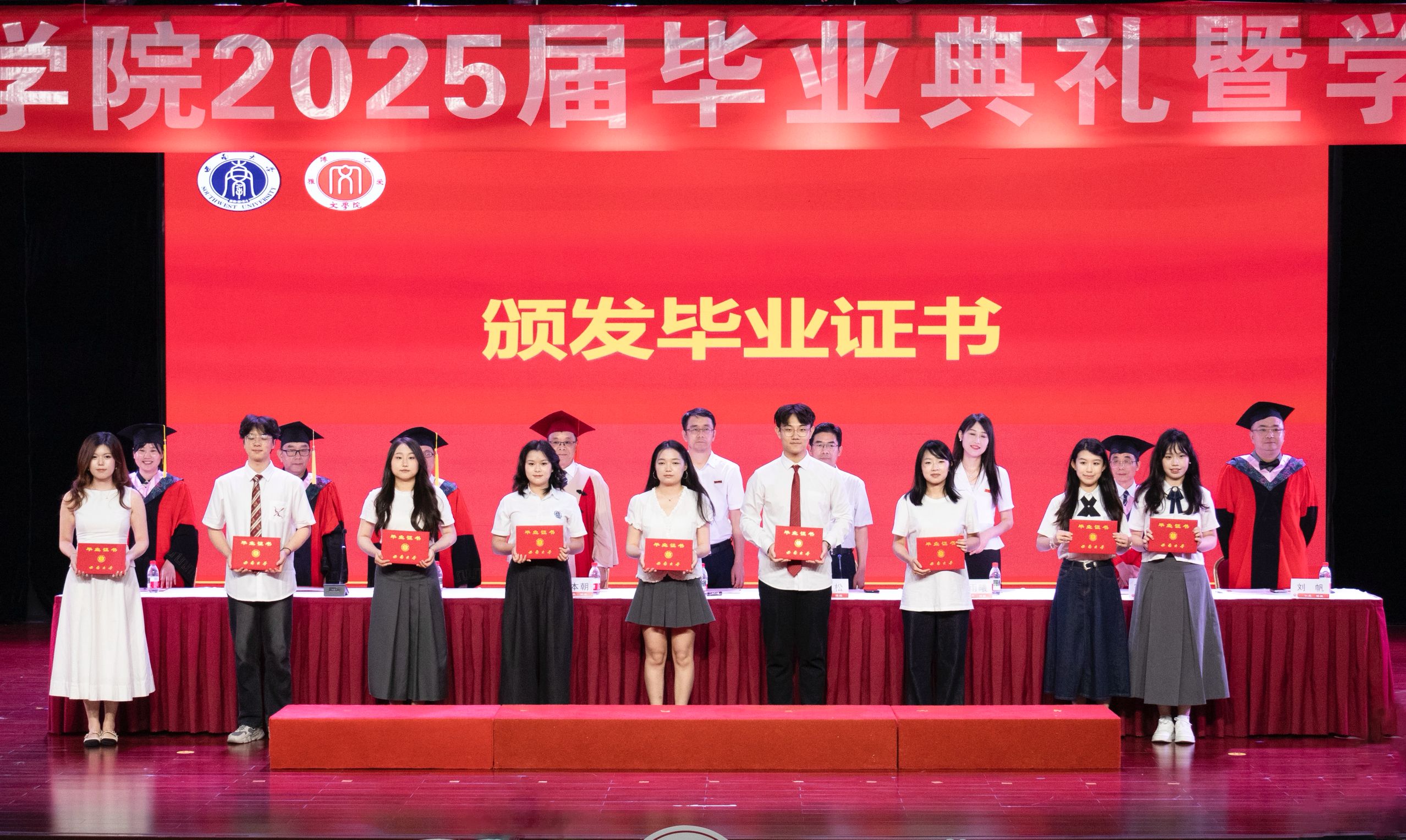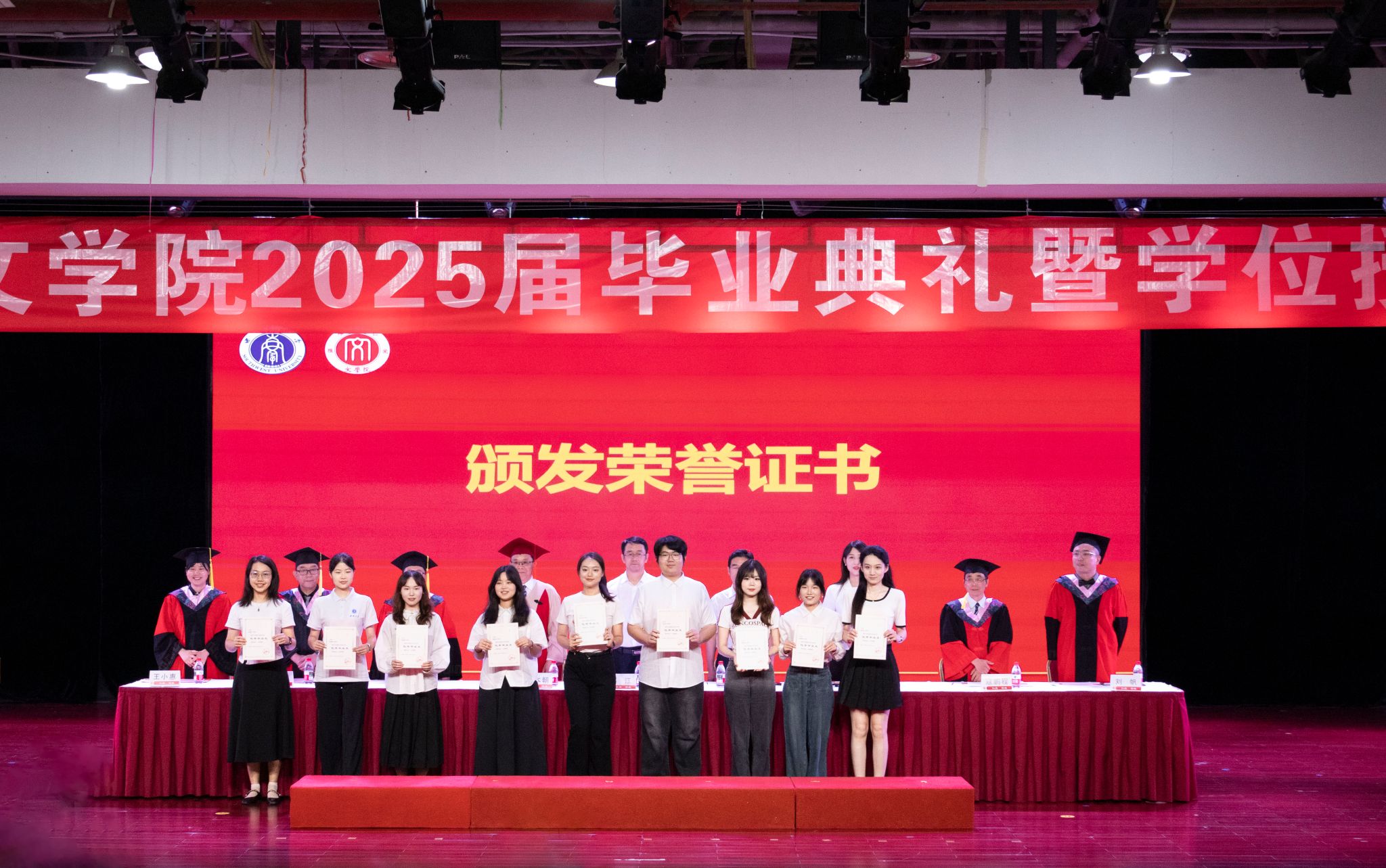 全体博士研究生毕业生、硕士研究生毕业生,本科生毕业生代表依次上台领取毕业证书。荣誉称号获得者上台接受表彰。员工联络员上台领取聘书。