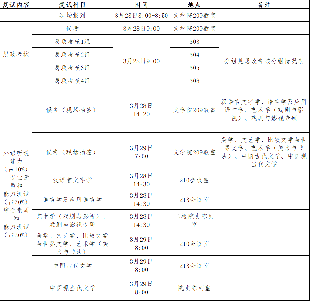 复试工作均在taptap188官网入口(雨僧楼)进行,3月28日8:00-8:50在taptap188官网入口209教室分组报到并候考参加思政考核,3月28日-29日分专业到taptap188官网入口209教室候考参加外语、专业、综合素质面试考核。
