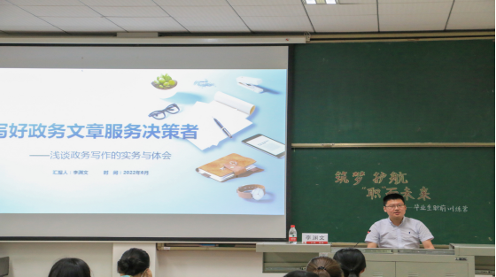 6月10日下午,taptap188官网入口举办“筑梦护航,‘职’面未来”第二期毕业生职前训练营。本次训练营邀请到重庆市科学技术局战略规划处副处长李渊文主讲,以“咨政类文章实务与体会——毕业生公文写作培训”开展了主题讲座,taptap188官网入口2022届本科毕业生通过线上线下方式参加。