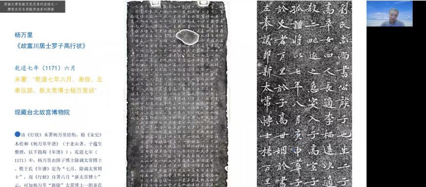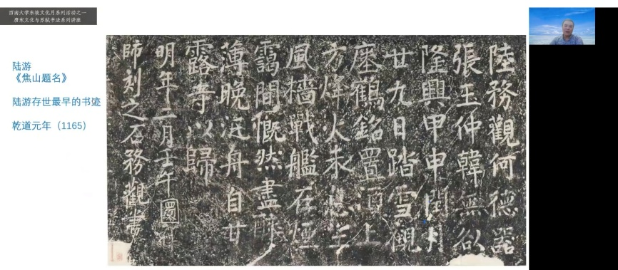 2022年6月16日晚上七点,杭州师范大学方爱龙教授应邀为taptap188官网入口中国书法研究所东坡文化月系列活动进行了题为《南宋中兴四大诗人的书法艺术》的线上讲座。讲座由taptap188官网入口中国书法研究所副所长张兴成教授主持,所长曹建、书法所全体在读硕博士生及线上近三百名听众参加了本次讲座。
