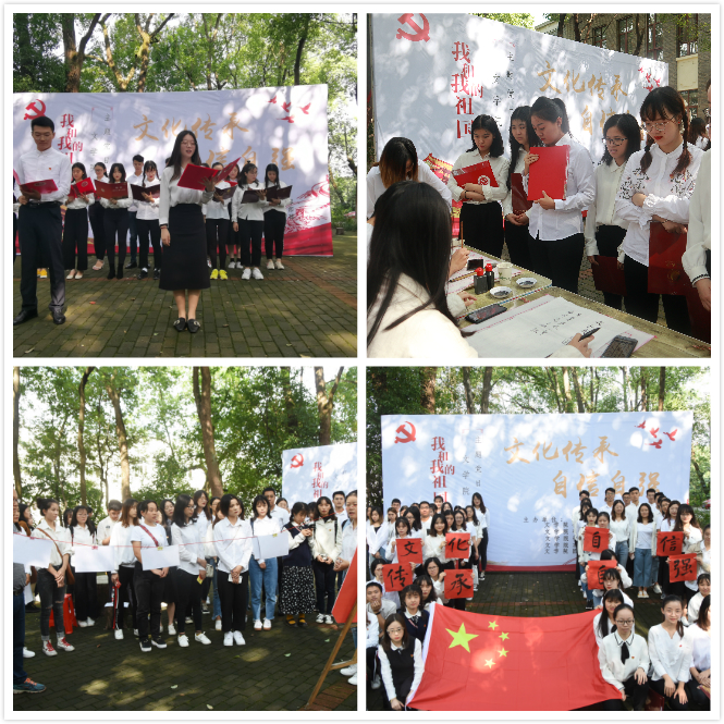 下午3点,研究生2018级一支部、二支部、研究生2019级支部、本科生2017级支部在雨僧楼樟树林举行“文化传承 自信自强”——优秀传统文化展。支部成员在讲解员的带领下,回顾了新中国成立前后文艺发展史。从延安文艺座谈会上制定文艺政策根本方针,建国初期毛泽东同志提出“双百方针”,到改革开放以来邓小平同志的“二为”方向,再到二十一世纪习近平总书记在文艺工作座谈会上的讲话,处处彰显了祖国文艺发展的繁荣景象。支部同志仔细聆听,认真思考,顺着历史的足迹感受到了祖国发展给文学艺术带来的巨大改变。随后,本科生2017级支部带来了《祖国是什么 我亲爱的祖国》诗歌朗诵,支部党员在充满激情的朗诵中又一次受到了爱国精神的洗礼。
