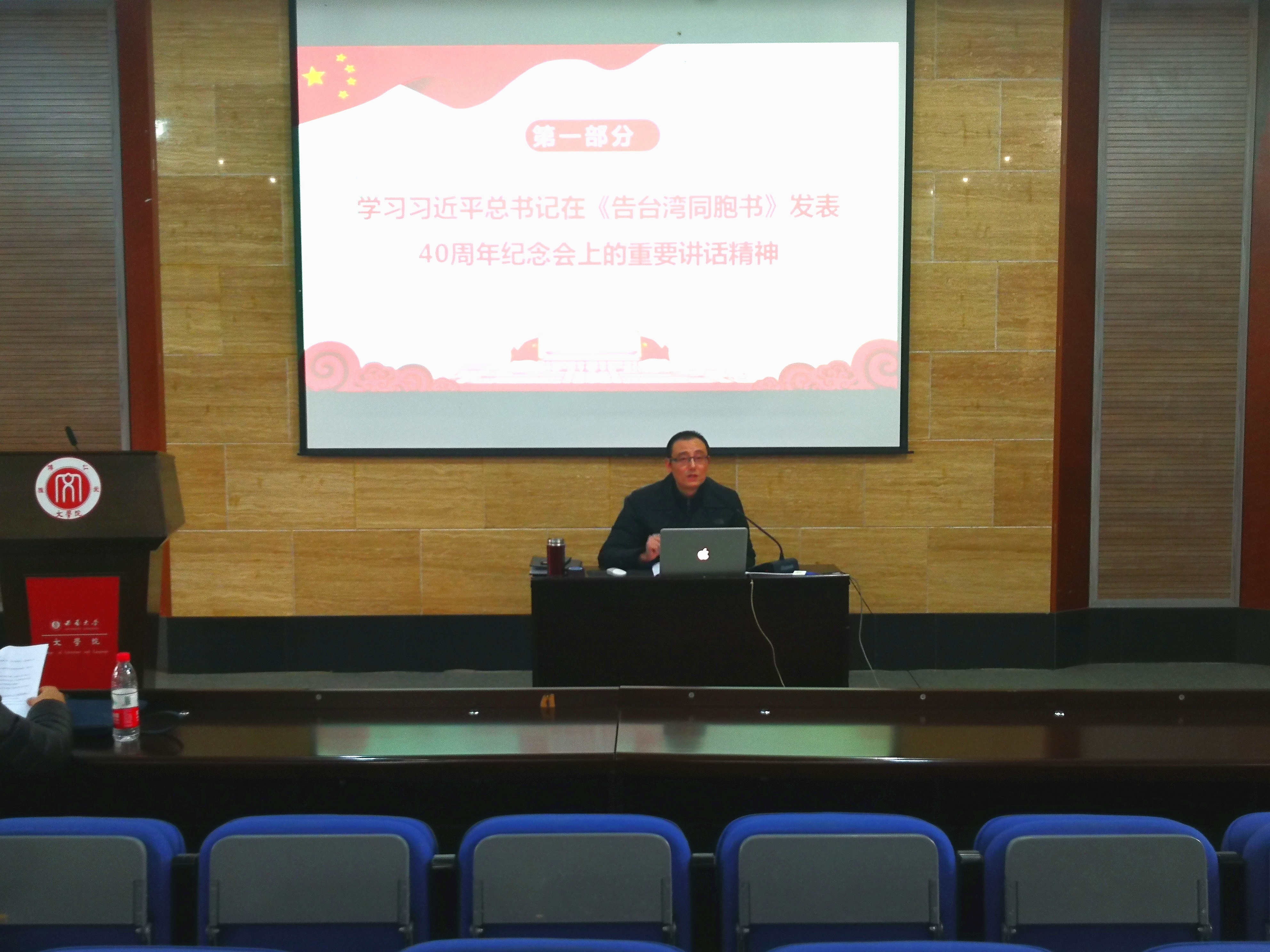 会上,黄杰书记主持学习了“习近平总书记在《告台湾同胞书》发表40周年纪念会上的重要讲话精神”。 总书记强调,祖国必须统一,也必然统一。两岸关系发展历程证明:台湾是中国一部分、两岸同属一个中国的历史和法理事实,是任何人任何势力都无法改变的!两岸同胞都是中国人,血浓于水、守望相助的天然情感和民族认同,是任何人任何势力都无法改变的!台海形势走向和平稳定、两岸关系向前发展的时代潮流,是任何人任何势力都无法阻挡的!国家强大、民族复兴、两岸统一的历史大势,更是任何人任何势力都无法阻挡的!祖国必须统一,也必然统一。这是70载两岸关系发展历程的历史定论,也是新时代中华民族伟大复兴的必然要求。